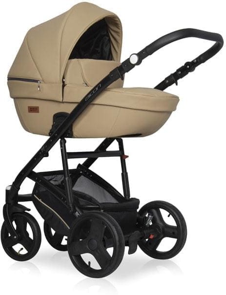 Коляска Riko Basic Aicon Ecco предназначена для детей с рождения до 3-4 лет. Все расцветки выполнены в спокойных благородных тонах и очень красиво смотрятся вживую. Для пошива внешних чехлов производитель использовал качественную эко-кожу. Такой материал хорошо сохраняет тепло в прохладу, не парит летом, легко очищается от загрязнений, устойчив к морозу и ультрафиолету. Внутренняя вкладка в спальной корзине сшита из натурального хлопка, приятна на ощупь и легко снимается для стирки.