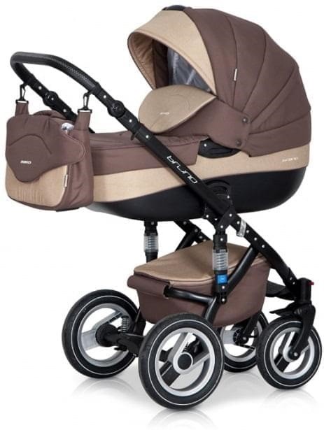 Рама коляски Riko Bruno изготовлена из алюминия, надувные колеса на подшипниках и усиленные амортизацией из 4 пружин позволяют модульной системе с легкостью проходить сложные участки пути. Пара передних колес поворачивает коляску вокруг своей оси, в сочетании с удобной ручкой это обеспечивает маневренность и удобство управления. На неровной поверхности передние колеса можно зафиксировать для езды только прямо.